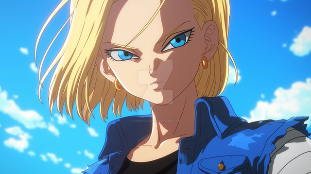 La androide 18, de las mujeres más bellas de todo Dragon Ball, con su belleza única.Captura de pantalla de la serie Dragon Ball Z, con resolución mejorada y buena calidad de imagen.