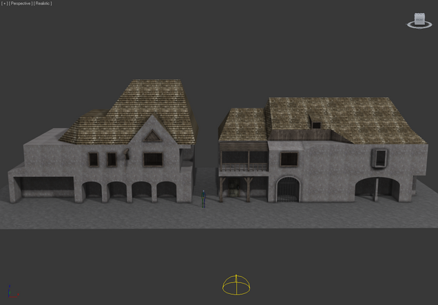 The texture scale thing has been stated. Lastly, the front building and back building have different scale on the doors. The back three are the same height as the front one and it's 2nd story windows put together.