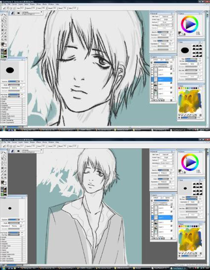 Thank you very much! This I use custom made brush made by I think this deviant [link] and alter it little. It is just solid colour, very pressure sensitive brush!