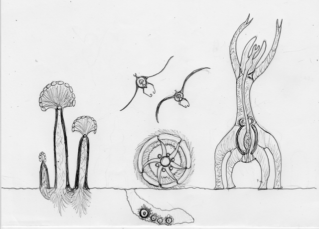 these are doodles based on some mechanisms that pop up in The Voynich Manuscript. based on my perusing of "Alchemy & Mysticism", I feel like they have to be contraptions used for the transformation of matter, probably for pharmaceutical applications considering other peoples' studies of the Manuscript. There's also a lot of plants in that book, and weird maps that are reminiscent of the fortresses that alchemists would use to depict the transfiguration of material into the lapis. sweet.