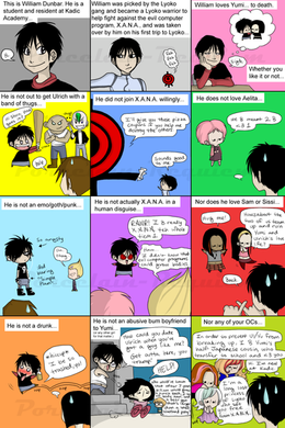 I'm tired of the canon eye colors people often give them (William = black, Odd = purple, Jeremie = blue, Ulrich = green, etc..), so I gave each character my own choice of eye color (minus Aelita).