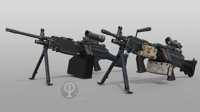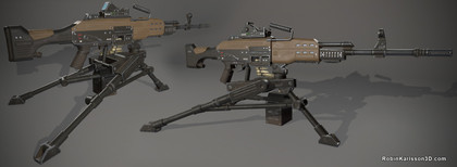 Fictional (SciFi-ish) machinegun, soon available at Daz3D.com. Two of the six material options shown.Related content