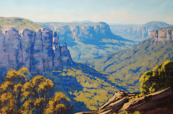 This is painted from a trip to Springbrook, a beautiful forested escarpment in the Gold Coast hinterland in SE Queensland.There are walks among the tall trees along the top of the cliffs which give a wonderful sense of scale and distance. This is what I was trying to convey.
