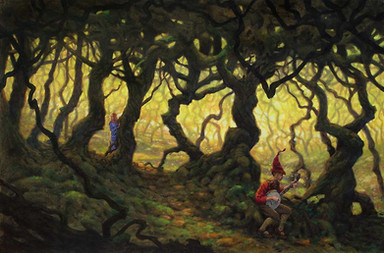 I think this contrasts beautifully with another very fine work of yours, "Away from it all". This abode is surrounded by twisted, gnarly old trees, an ancient, musty air envelops everything. I don't know if you put hidden imagery in your works, but there seem to be watchful eyes all around. I also love how you add subtle changes in terrain, the ground gently sloping down at the far back. The overall mood of it would appear to be one of bitterness, ill-will and malice, if not for that patch of sunlight falling in front of the doorsteps. It looks like a hermit's dwelling now. From spreading gloom onto a coarse pathway aglow in the soft, filtered light of mid-morning. Splendid!
