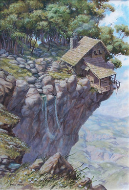 Away from it All is quite the opposite. A cottage nestled on a cliff's edge, wide open spaces all around, a gentle stream, fresh breeze, birds, a lazy afternoon; all the right elements that make a perfect family vacation. All, except for that darkness hiding among the trees on the left. What I want to emphasize is how light, or the lack thereof, changes the feel of a painting, and you, my friend are a master at it. Sorry for this very long comment, but I felt I had to write it. Super creation!