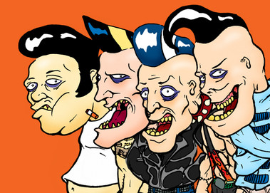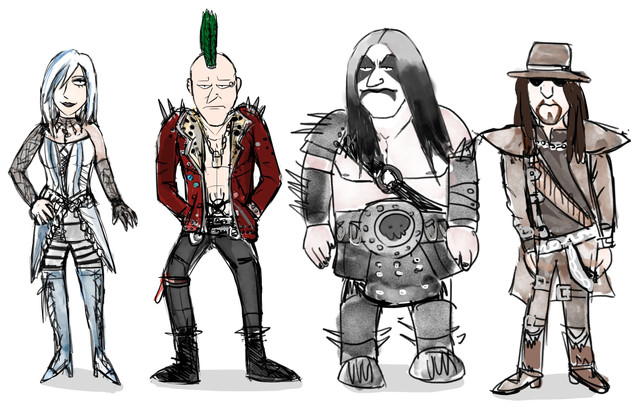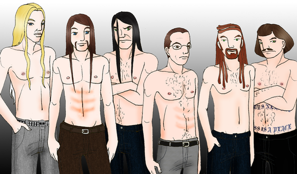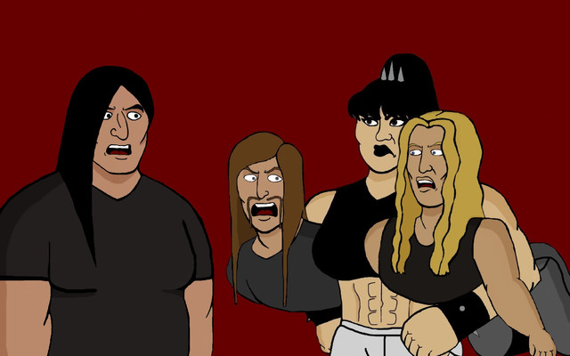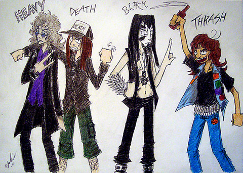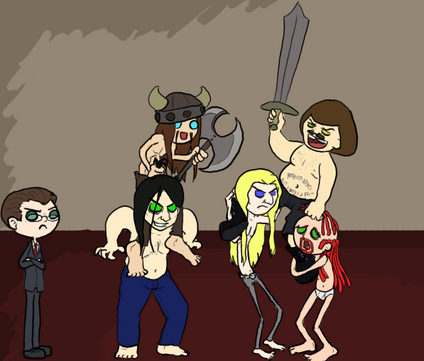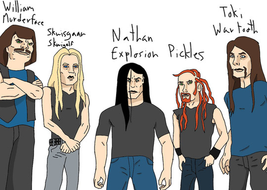 Wow, this is so deliciously creative and weird! The details are awesome... I keep looking and noticing new things. Murderface's shirt, Nathan's bloody hands, Toki's gaze specifically at Skwisgaar... and love Skwisgaar's "I don't give a f*ck" expression!