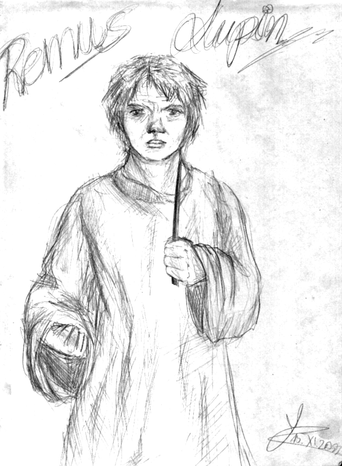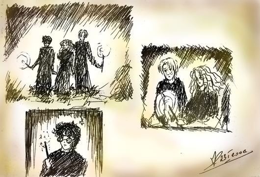 bardzo podoba mi się cienowanie na tym rysunku, wyszlo doprawdy pięknie (twarz Harry'ego, ściana, gazeta/książka, drzewa)