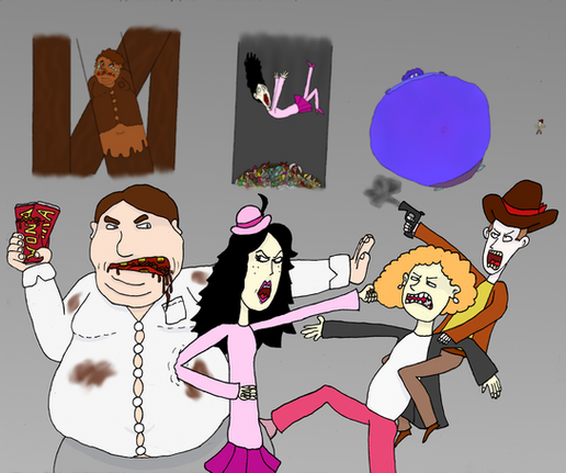 Well, I'm back on a Charlie and the Chocolate Factory kick, and I decided to make new character portraits for the characters. I may even do the "good guys," this time! But, of course, brats come first, beginning with Augustus Gloop. I'm very happy with how he came out here, because it's the first time I feel like I've really conveyed how... big he is. I picture Augustus as a very, very overgrown toddler; someone who's extremely coddled by his mother, with an overinflated ego to match his stomach. He's all take and no give, and basically thinks he's got a right to everything he wants (and what he wants is mostly food). He doesn't consider or care about others' feelings, only his own. His mother has given him the illusion of a world without consequence; she gets him "friends" by threatening their parents, keeps him out of trouble in school by threatening teachers and principals, and makes sure he is constantly supplied with nourishment, all with the purpose of keeping her little angel happy. But in Wonka's factory, where actions have consequences that Mrs. Gloop can't control, Augustus doesn't fare so well...