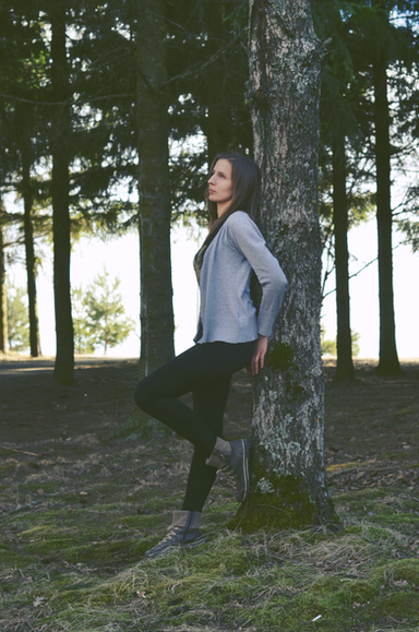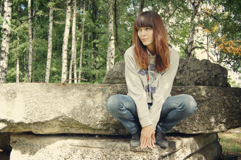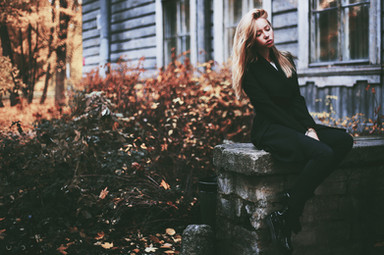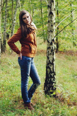 I like the job you did here. The leaves on the ground the distant trees give a sense of lost-ness and the manner of the model a sense of calm amongst what should be a confusing situation. Good call with the model, she's very fit, and her manner of dress accents her features without making her slutty. She's moderately attractive, a kind of plain jane effect if you will, you may wish to go with a softer face model in the future for aesthetics. Great job though, very good work!