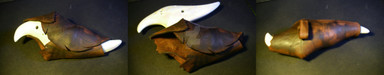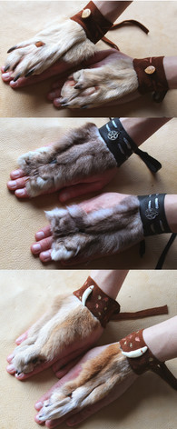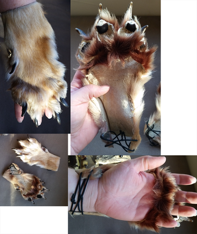 These are a pair, right hand/left hand, of clawed hand wraps, designed to fit over the hand with a buckle to adjust tension at the wrist.Made of 6oz Veg tanned tooling leather, the digits are wet molded around the claws with boiling water to create a tight hold on them, reinforced with rivets.