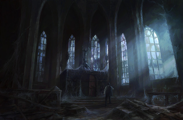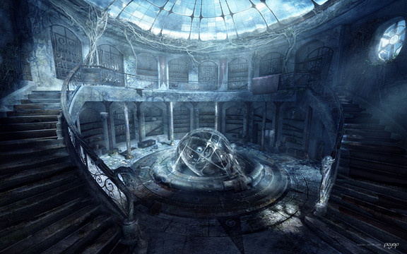 amazing work! i love the lighting u used from the door and how the strings fall across the room. The bookshelves look ancient and untouched for a long time!