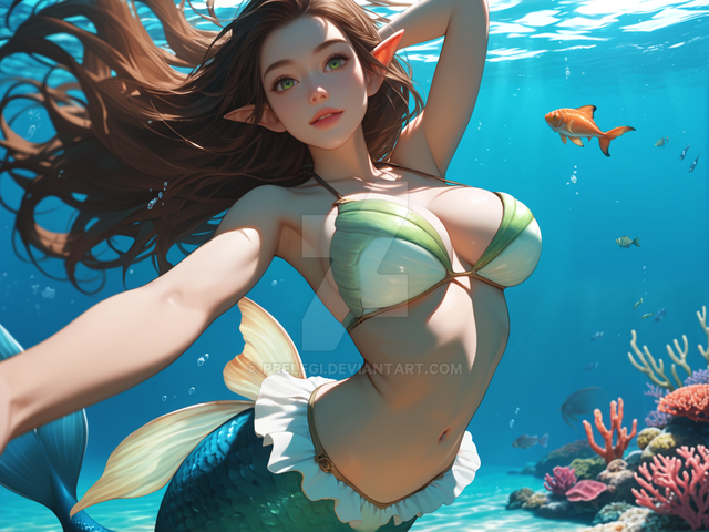 #digitalart #animegirl #ai #beauty #cute #elf #elfears #elffemale #elfgirl #elvengirl #elves #fins #mermaid #ocean #pointyears #pretty #semirealistic #underwater #waifu #aiassisted #prelfgi