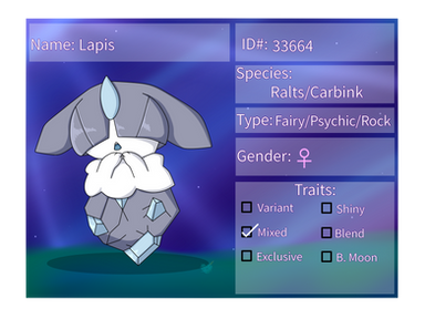 Bio: She's a dedicated member of the Fairy Guardians, a group advertised to protect the world from the clutches of Blood Moon Darkrai. Despite a good looking resume, the group itself, and the leader that manages it, are very twisted and wicked in nature. The group claims to "stop Darkrai and his baddies" but go farther, and are dedicated to killing every dark type that dares to breath the same air as fairy types. Despite not being the leader of the Fairy Guardians, Pixie may be more loyal to the cult than the leader is. Pixie has a screw loose, possibly a couple dozen. She acts as Angel's side kick, aiding in the majority of their missions, and played a part in crippling Tod beyond recovery. Pixie looks approachable and she knows it. She uses her child-like appearance to shelter her core of hatred. She appears collected and even bubbly, but at heart it's all a hoax.