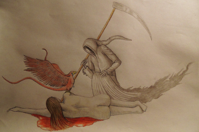 This is a drawing I copied for my art history class. The original is called Prometheus Bound by Peter Paul Rubens (1577-1640). I chose to focus in on just a portion of the painting where the eagle plucks on Prometheus' liver. According to Greek mythology, Prometheus stole fire from the Gods and as punishment he was chained to a rock where an eagle plucked at his liver each day that had gone by.Done with charcoal and colored pencil on bristol board