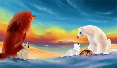 in my opinion i dont think the background needed to be that complex, there didnt have to be mountains or a sunset or a little village because its kind of drives the focus from the animal circle. the snowfall wasnt needed but it did give it a nice feeling and texture, but again it got a bit complex in the background. i think it would've been fine in just a cave or whatever.