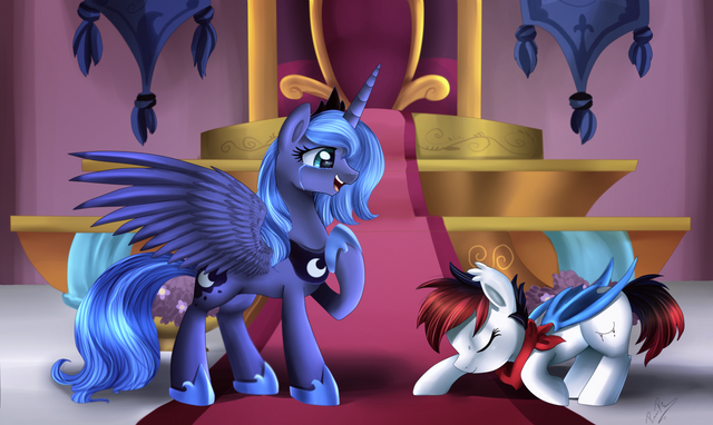 Dirge serves luna as an unofficial champion. His knowledge of dragons intrigues twilight who also researching him sense he half dragon. Celestia does not like him one bit so is just annoyed at his presence in the castle.