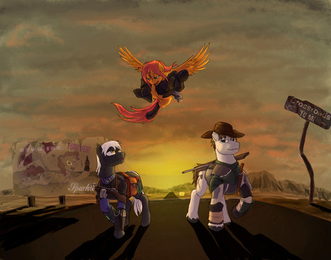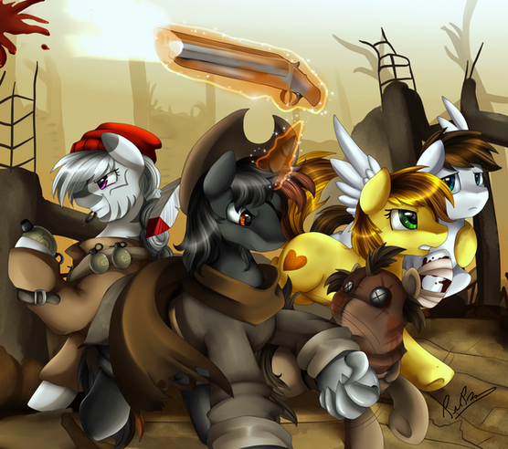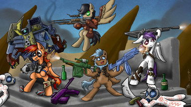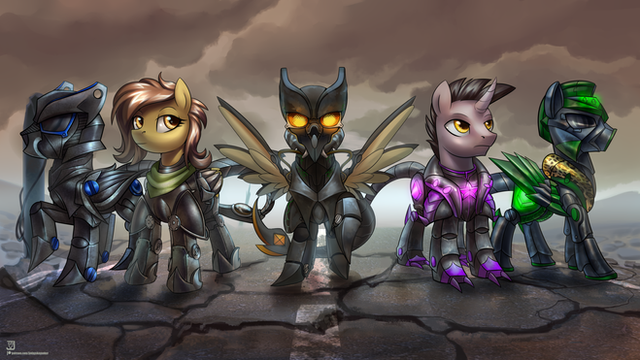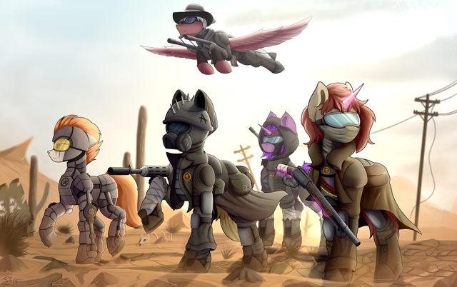 #armor #combine #crew #crossbow #desert #dunes #earth #fallout #fanfic #group #light #mountain #oc #ponies #pony #scorpion #standing #sword #unicorn #zebra #pridark #pipbuck #little