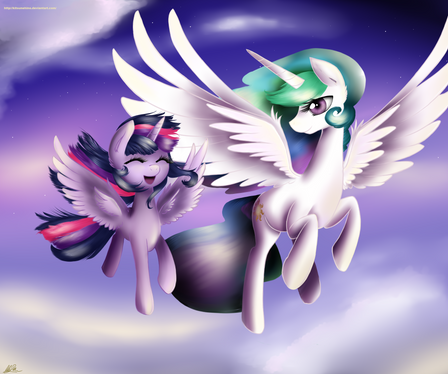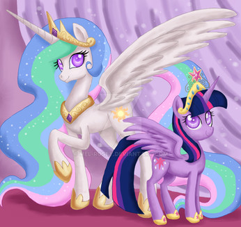 Nunca sabre como realizas tan bueno trabajos, al ver este dibujo uno ve a una maestra (Celestia) y su alumna (Twilight), pasando un rato muy agradable juntas.......