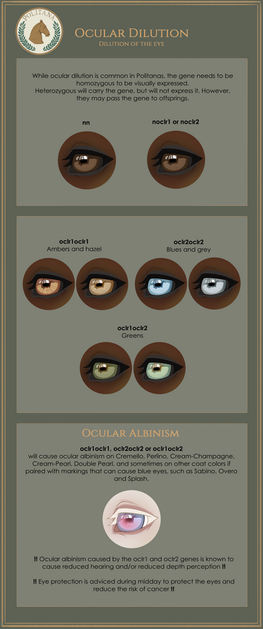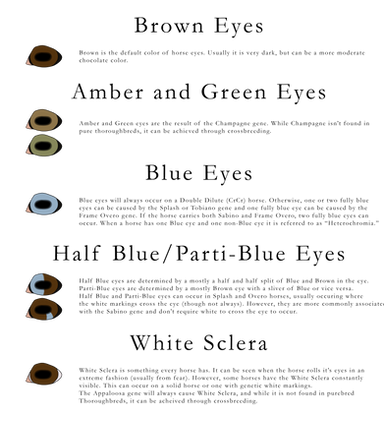 Eye color is semi-specific in Elysium and tends to follow most natural coat colors rules. Eye color doesn't change until the introduction of dilution genes such as cream, champagne and pearl. Additional eye colors are possible with genes like Gemstone or if a natural white pattern touches the eye. Special cases are listed below on when eye color changes or doesn't.