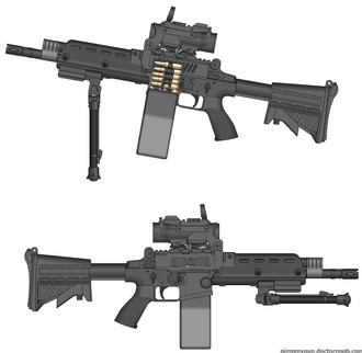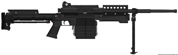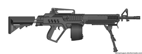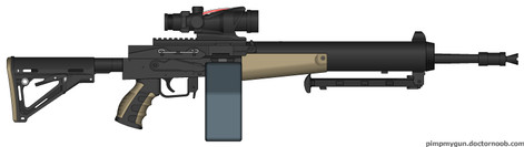It is quite a complete weapon. Not only it fits all typical shooting variants, also it has a high capacity cilinder magazine, cheek rest, simple red dot, and integrated grenade launcher, all in the same basic structure. It can also suit other accesories, like bipods, laser sights or lanterns. Multipurpose all terrain weapon for normal infantry in any situation.