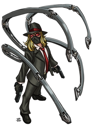 An original character created by Owen KC Stephens.Equipment includes: Web Weapons (web-gun, web-grenade, web-mine), paralysis-inducing poison darts, spider-cuffs, flying spider drone, spider tracers.
