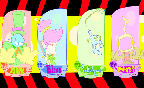 Originally I was going to have myself with Crumbs and the girl since I had struck a plea bargain with `delya for permission to use more than one character*, then decided to include Drizzle, then thought I'd use all of the 2nd cast and put the rest in the background in heavy shadow. Eventually I went back to my first idea when I remembered how much work it woud be. But I did make the outlines of the 'toons thicker so as to differentiate. Ain't I thoughtful?