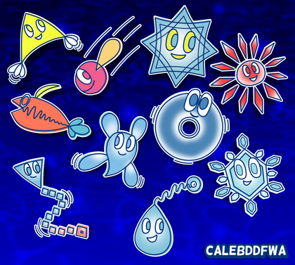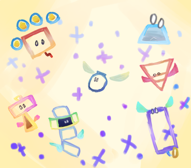 Yet another example of me taking the time in which I should be finishing commissions to do something I just plain wanted to do.We see here the Pixls, the helper-friend-types from Super Paper Mario. Each one allows the heroes to do a specific thing; Cudge allows them to hammer things, Fleep allows them to flip panels around, et cetera. The two central Pixls, Tippi and her cybernetic replacement, Tiptron, are used to get hints and tips about the environment around them.