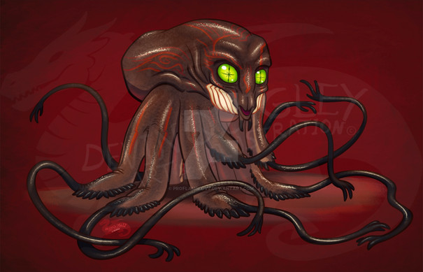 The average adult Alhat stands up to about 9 ½ feet at the fore shoulder. They are lifted off the ground by a brightly-colored dorsal balloon sac filled with lighter-than-air gases. They have ten, tentacle-like limbs, eight of which are used to propel the Alhat, like legs. The remaining two are used as arms. Their bird-like head has a thick bony plate on the dorsal side. They have eight small eyes that see in the infrared spectrum; otherwise, they navigate largely by means of sonar. Along their bodies and in the posterior side of the head are tendril-like organs called cilia, that help the Alhat keep balanced, kind of like the whiskers on a Gaian cat. They are liquivores, consuming foods that have been converted into a soup-like liquid through their long proboscis, which is normally kept hidden below. They are hermaphroditic, but individuals are capable of choosing their sexual identity as male or female. They are oviparous, laying brightly colored eggs which hatch into 6 inch long larvae that are able to fly by means of their dorsal balloon sack. The parents tend to their young for the span of up to twenty-five years, until their offspring have reached adult size and are no longer completely airborne. The lifespan of an Alhat, thanks to anti-aging technology, is up to three-hundred Terran years; it was formerly far shorter, only about 30 years.