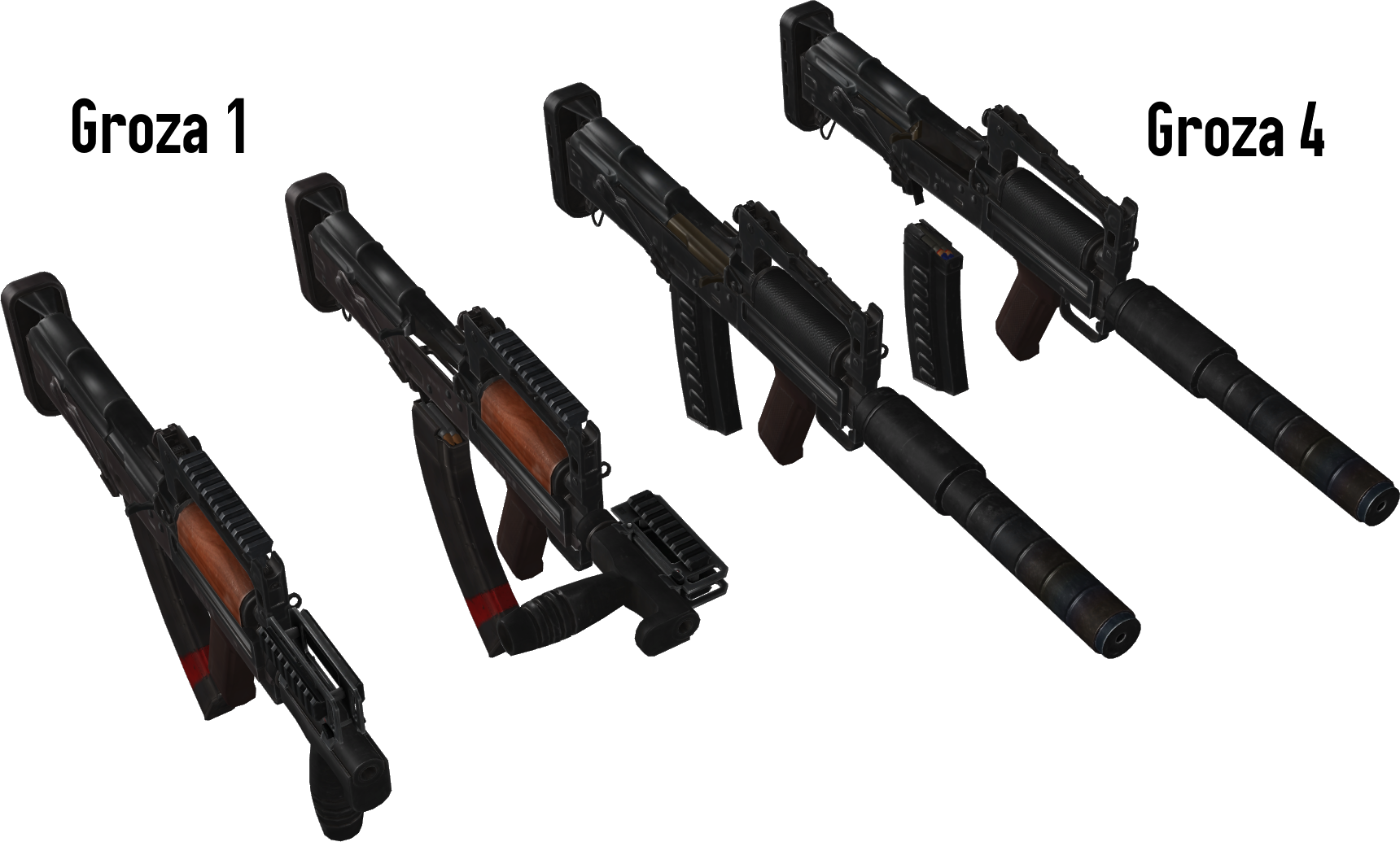 Requested by iWarz07Groza 1 is derived from Groza 4, so I decided to make them as one model. You may change their parts using optional items. You can, eg, use Groza 1 body and barrel and Groza 4 mag.