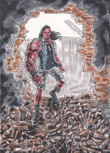 pin up drawing of Zero Unit comic character Meta Omega, a super powered enforcer working for madam EkeiteMeta Omega is a near indestructible combatant, super strong, fast, and impervious to all kinds of attacks, that includes gun fire, explosions and blunt force trauma