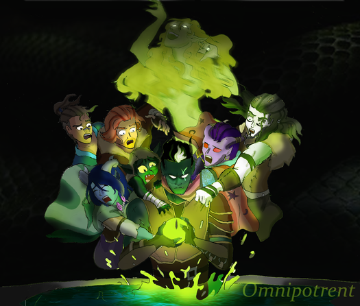 I love the magic elements of this, but I think a few alterations would give this piece more direction, and be easier to follow for the average viewer. (If this is a reference picture, having the reference would be extremely helpful – going to review as if it isn't). The spooky eyes peeking out from the darkness in the future/distant space seem a little confusing and I think would work better in front of the demoness, lightly transparent. I would also place an aura around the back of her, just to make her look more dangerous. I'm unsure about the clothing vs. hair on the female in the middle – her hair makes her seem like she should have a bit more detailed/interesting clothing. I'm also a little confused about the hair of the male on the left – it doesn't look well placed and the texture is a bit off from the rest of the art.