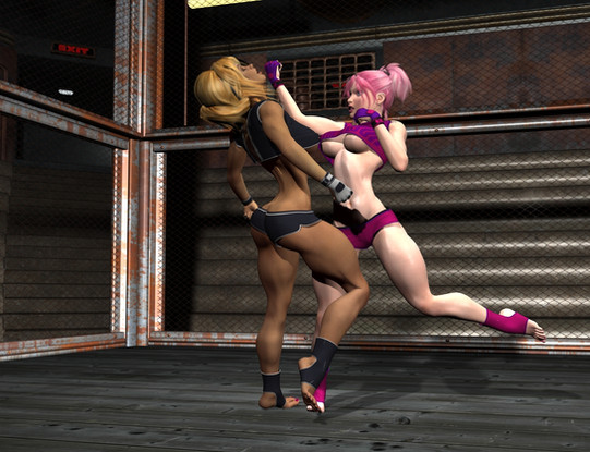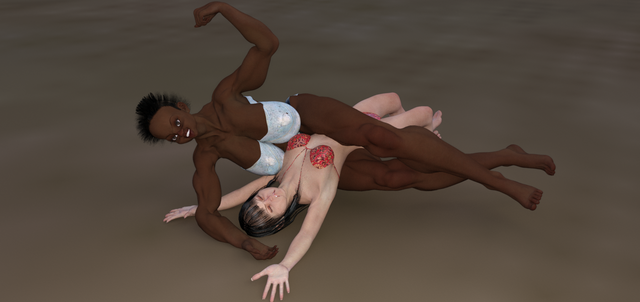 the woman on top is smiling, watching her opponent squirm, the woman that is pinned, her eyes are fixated on those breast that are hanging over her....stretched and waiting to be finished I would think.... just makes my mind conjure up all kinds of scenario's..
