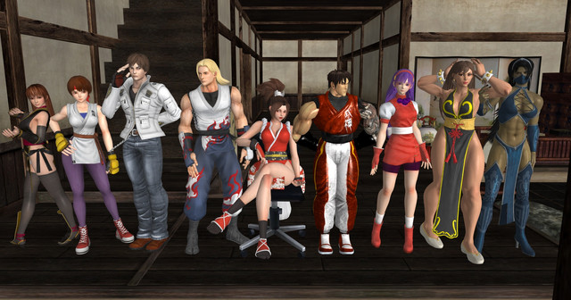 With the exception of Kasumi, everyone looks really rigid and uncomfortable. And the character placement looks a bit off. So, I would have placed them all directly infront of the statue. But here you seem to have them on a bit of an angle. I also would have place them in a V formation facing outwards. With Kasumi up front facing the centre. Momiji and Ayane on her flanks facing outwards slightly, and finally Rachel and Eileen on the wings almost facing left and right respectively. Also, more on the poses. They don't really look dynamic. Rather, they kinda look like they're just standing there(Rachel's the biggest offender here). I would have widened those legs alittle, and raised the arms alittle more to start with. I'd show you what I mean, but SFM's my primary platform right now, and outside of LordAardvark's massive tiddy models, there isn't actually alot of DOA5 stuff for SFM.