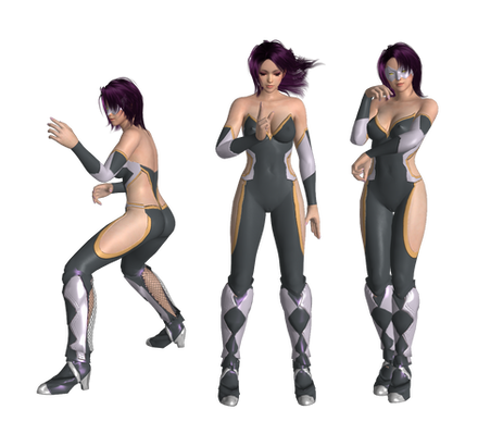 Asset Notes: I used her default costume from DOA5, clipped the shoe stilts and merged her X3 torso. Her Hair and Dark Prison costume are from VV and also merged with her X3 build. The pose is a still from one of her win animations, so normal cheats apply there.