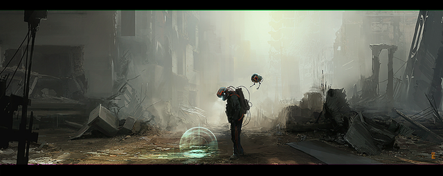 If I could make a story behind this, I would say, this guy was a survivor after a battle and was forced to retreat. On his way back, he had to pass through several damaged structures as a shortcut back to his base and while he was heading back, he encountered a Tech-Bug Drone (TB) and was forced to stop because it was a "Spotter". He ran away while it followed him and beeped sounds to alert enemies nearby for them to follow while the bug is on the chase.