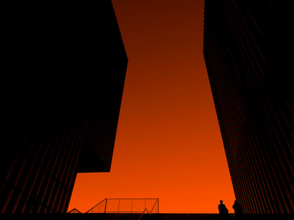 An abstract and slightly surreal, depiction of the gap between to buildings in the downtown of Dusseldorf, Germany, at sunset.