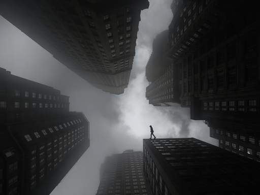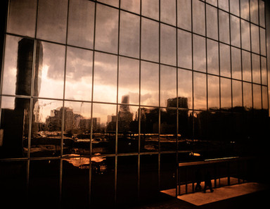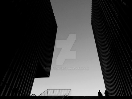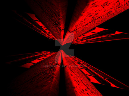 An abstract and slightly surreal, depiction of the gap between to buildings in the downtown of Dusseldorf, Germany, at sunset.