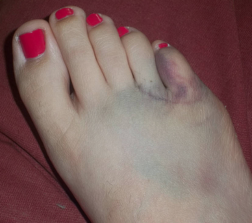 And though I'm no doctor, I've had a number of broken bones in my life... quite a few of them toes that looked similar to your poor li'l piggie there. I'd say it's most likely broken. Too bad the only thing you can really do for a broken toe is deal with it.