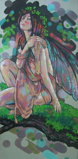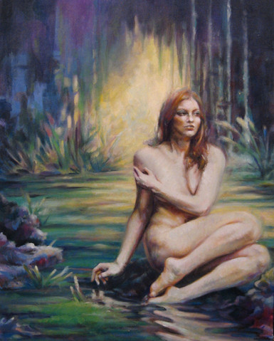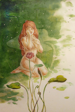 Nice color choices; I like how you rendered her skin in bold hues of red and blue-green. It makes her part of the nature around her.
