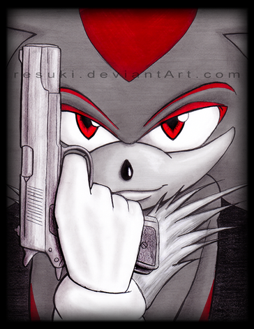 ...I just felt like drawing Shadow with an assault rifle, I'm not sure about who's he aiming at, though.This is the second work that was lined by the SAI paint tool, the result is very nice with this style too, in my opinion.
