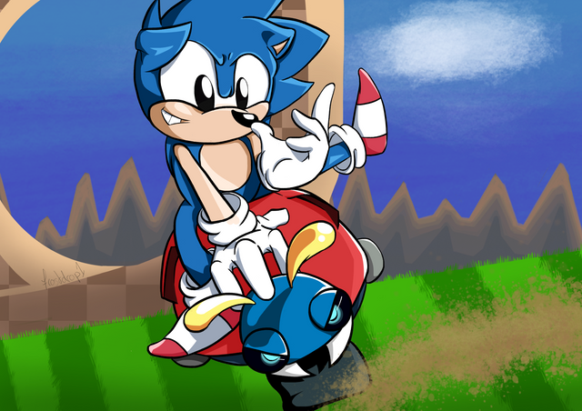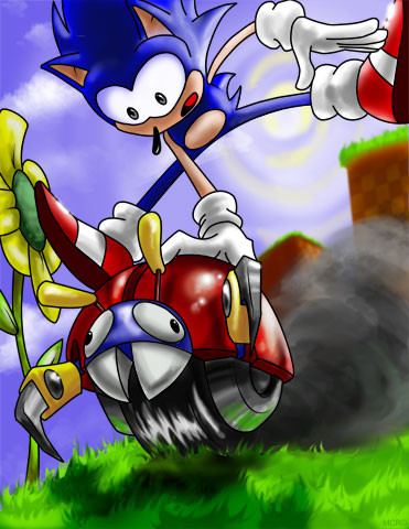 I wish there will be a vehicle like this one in Sonic & Sega all stars racing.It's Sonic the Hedgehog riding the speedy motobug. I also made the BG myself, but have no idea what place this is.
