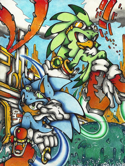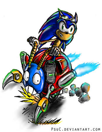 I could imagine sonic infiltrated eggmans factory and eggman comes to him in a machine and when he arrives, sonic is riding a monno bug around in a circle screaming wheeeeeeeeeeeeeeeeeeeeeeeeeeeeeeeeee!!!!!!!!!
