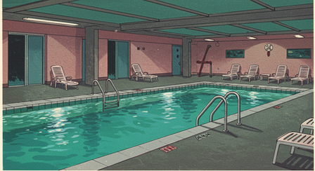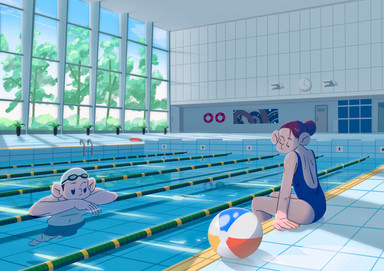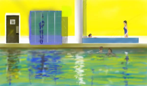 Great work! The reflectiveness in the water and windows looks great. The translucencies turned out great too. I REALLY like the water effects. I also like the "Pool Rules" sign. The splashing was well done, in my opinion. Very appropriate for the speed at which the swimmer seems to be going, a leisurely pace (which suits the whole picture in general, by the way) because it looks like the splashing is small and choppy. I think the water could look a ~little~ better, but I understand that it would take a huge amount of work to get it to look much better than it does. Water is VERY hard to draw... so you should be commended for how it looks right now! Great work