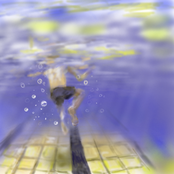 Everything in this picture reminds me of glass - the water, the walls - it's all so pristine and bright! And the focus is more on the room itself, rather than the swimmer... ...in fact, the swimmer seems like it's part of the waves (the peach and white work well together to almost disguise the swimmer). This is extremely impressive, especially because of all of the vectors! Well done!