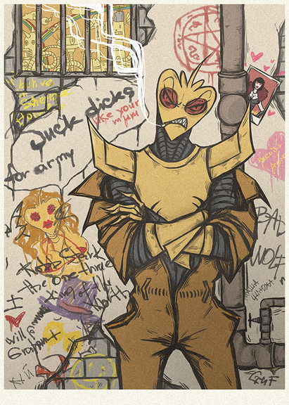 Face is not the kind of face I would expect for him but it's still really cool and I also love his expression. Your colouring style is really interesting too!