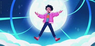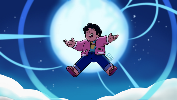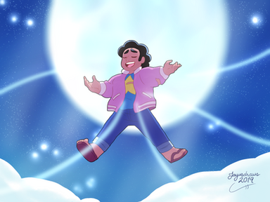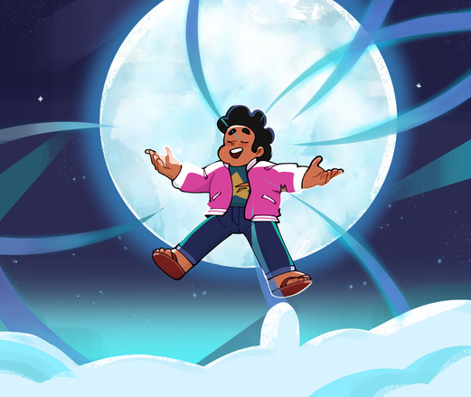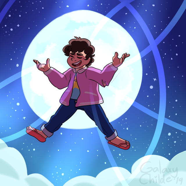 STEVEN. You've done a beautiful job with the line art and colours here. I can feel the three dimensional shape of Steven, how the arms truly feel extended toward the audience and how he seems to be leaning back gently. I think seeing the underside of his shoes and the inside of his jacket really adds to this feel. The colours you've chosen for Steven's clothes and skin grounds him in the atmosphere of the image. The soft glow on his body from the moon is just bright enough and doesn't overcast his body or expression, which I think makes Steven look that much more three dimensional.