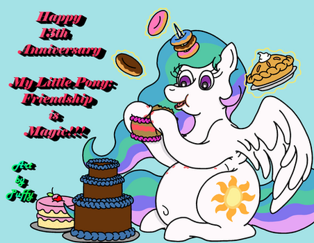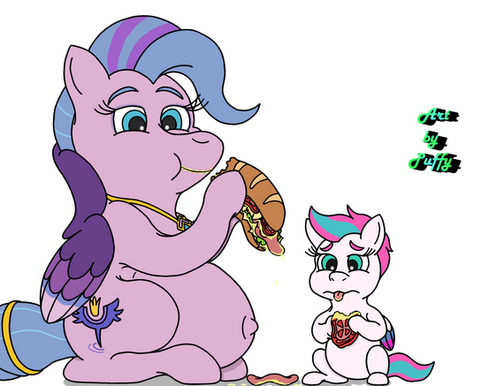 Zipp enjoying some chocolate. Hopefully she won't get a tummy ache from overeating.The whole Zipp loves chocolate thing originated with this post which shared the image from My Little Pony UK's Facebook page. After seeing these adorable sketches of a tubby Zipp by Bell-Pink-Savage I just had draw this and thus here it is(a few months afterwards but better late than never☺).