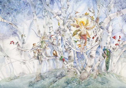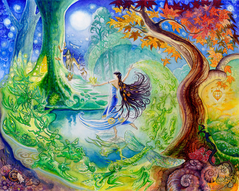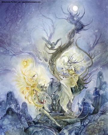beautifully painted dream quality. The masks hanging from the tree makes me want to know the story of the dream. The way you pulled the moon beams over the tree is fantastic. I would like to see the main figure's detail better. What is the halo surrounding her head?