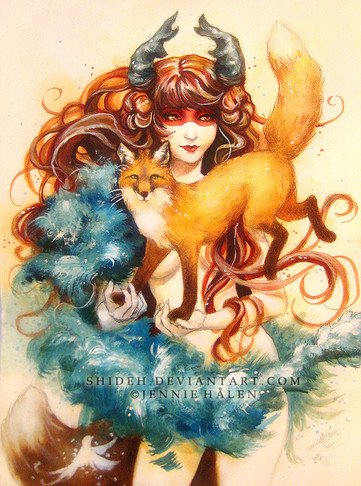 A beautiful painting, and I love the stories of these fox spirits! But they are not always benevolent...have you ever read the Korean folktale the fox girl? That one is frankly terrifying. o.O [link]