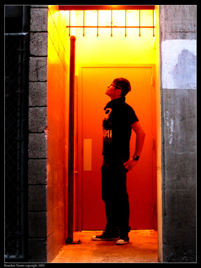 Oooh... the colors look nice. The blues and greens contrast the orange and browns well (cool colors vs warm colors) and the jacket kind of ties them together. And there is a kind of mood in the picture... of abandoment... maybe its the pose... idk... you just look dissapointed. lol